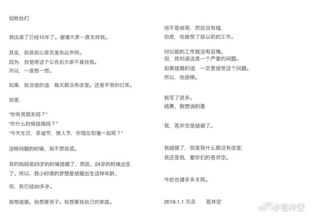 搜狐娱乐讯 日本AV女演员苍井空是多少宅男心中的女神,34岁的她婚姻状况也备受关注。1月1日,苍井空在社交网络上突然发文宣布结婚,她透露老公不是帅哥,也没有钱,但接受了她以前的工作。