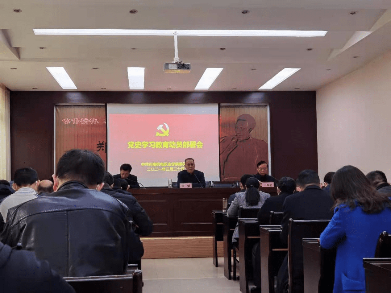2021年3月20日上午,河南机电职业学院召开党史学习教育动员大会。学习贯彻习近平总书记在党史学习教育动员大会上的重要讲话精神和省委高校工委、省教育厅党史学习教育动员大会精神,对学校开展党史学习教育进行全面动员和安排部署。学校党委书记张震、校长王本亮、党委副书记鲁俊民、纪委书记董险峰、副校长王发清、副校长王庆海,各部门、二级学院党政负责人参加会议。此次党史教育动员大会全面开启了学校党史教育活动。