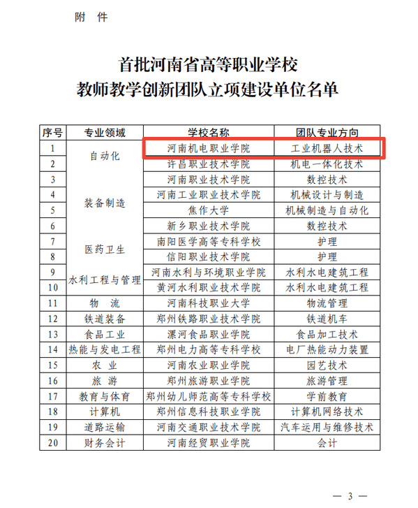 2021年2月4日,河南省教育厅公布首批河南省高等职业学校教师教学创新团队立项建设名单,河南机电职业学院智能工程学院申报的工业机器人技术教师教学创新团队成功入选。据悉,首批河南省高等职业学校教师教学创新团队立项建设单位共20 个,省教育厅将对省级团队建设予以专项经费支持。