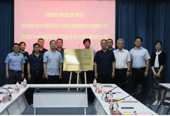 2021年6月10日,河南机电职业学院、河南城乡规划设计研究总院股份有限公司共建的HHD建筑环艺设计研究院在课程与培训学院108会议室举行揭牌仪式。河南城乡规划设计研究总院股份有限公司副院长刘志宏、室内设计院郑北分院院长程羽、景观规划分院院长穆战强、城市建筑分院院长李凌哲、郑北分院幕墙工程所商务总监陶惠平、室内设计院副院长李冰阳,学校党委书记张震、副校长王庆海、党政办主任杨健、设计学院院长刘语,以及设计学院师生代表参加揭牌仪式。