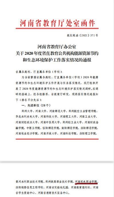 > 喜讯!河南机电职业学院被评为2020年度省直教育公共机构能源资源节约和生态环境保护工作先进单位2021-06-28