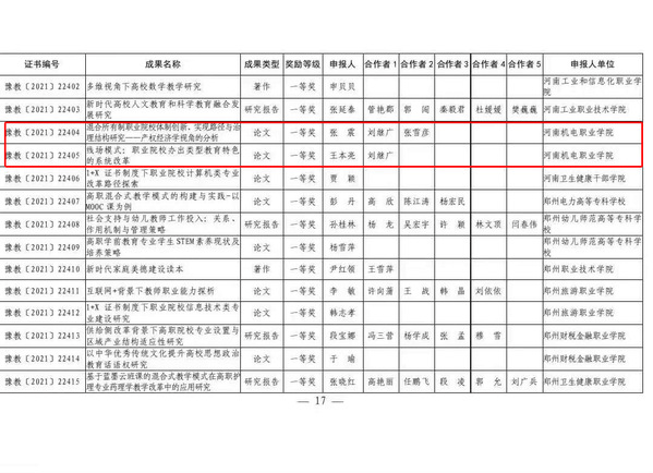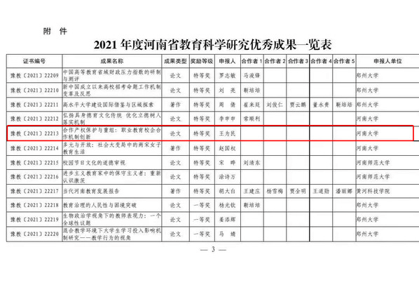 近日,接到《河南省教育厅关于公布2021年度河南省教育科学研究优秀成果的通知》,河南机电职业学院《探索发展混合所有制职业院校体制机制研究》项目组的3项研究成果荣获1个特等奖,2个一等奖。此次获奖,是河南省教育科学界对学校探索形成的校企合作办学成果的高度认可,也是对学校线场模式的高度肯定。