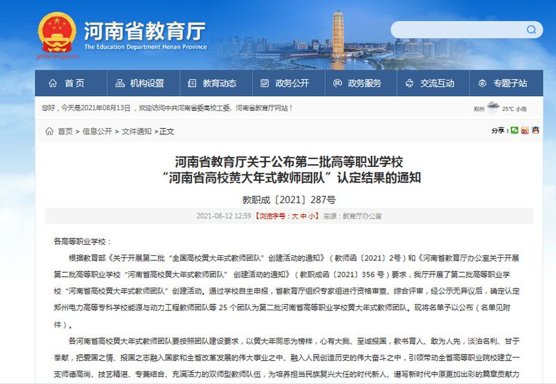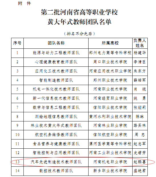 2021年8月12日,河南省教育厅公布了第二批高等职业学校“河南省高校黄大年式教师团队”名单,河南机电职业学院汽车先进制造技术教师团队成功入选。