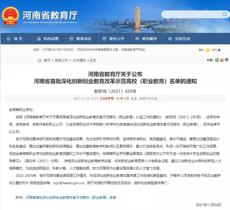 11月26日,教育部发布《关于全国普通高校毕业生就业创业工作典型案例名单的公告》,河南机电职业学院报送的《构建“三即”机制 实现育人就业无缝衔接》案例成功入选教育部典型案例。