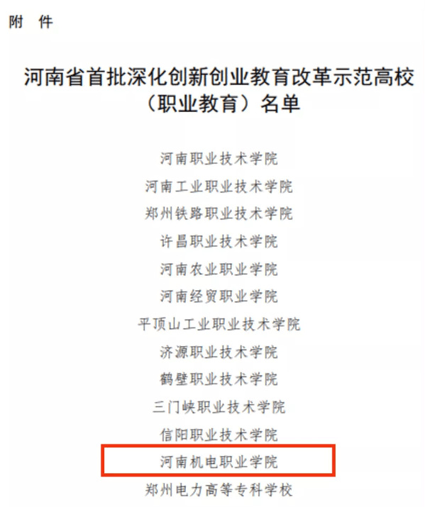 2021年11月26日,河南省教育厅官网公布了河南省首批深化创新创业教育改革示范高校(职业教育)名单,河南机电职业学院名列其中,被认定为河南省首批深化创新创业教育改革示范高校。
