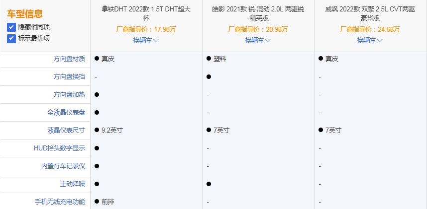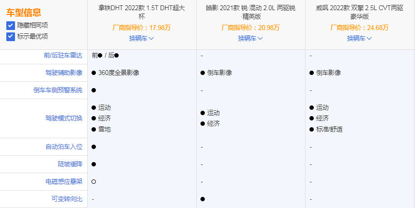 具体来看,我入手的顶配超大杯落地20万左右,可本田皓影和丰田威飒的低配也要20万起步,配置却如图所示,拿铁DHT绝对是碾压“前辈”的存在,并且关键是双田混动缺少的配置是我认为不可或缺的部分。