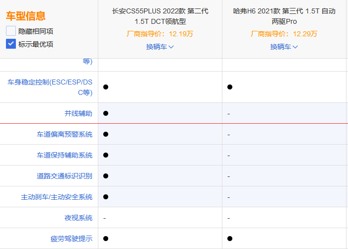 在安全配置方面,价格差不多的两款车配置差别还是有点大。同为12万级别的配置,可长安第二代CS55 PLUS 多了并线辅助,车道偏离预警,主动刹车等等。这方面对比下来,长安第二代CS55 PLUS明显更为实惠。