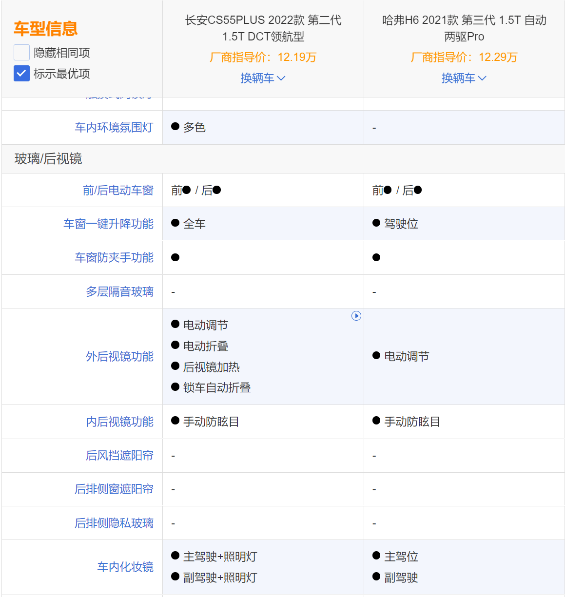 而在舒适性配置方面,长安第二代CS55 PLUS同样更为全面,后视镜电动调节功能更为丰富,而哈佛第三代H6在日常使用的便利性上相对较弱。