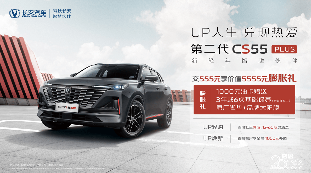 长安第二代CS55 PLUS新轻年智趣伙伴,交555元订金尊享1000元油卡、3年或6次基础保养(限首任车主)、原厂脚垫+品牌太阳膜等价值5555元的膨胀礼,新车用户购车首付低至两成,可享12-60期灵活选,置换客户专享至高4000元补贴,还在等什么?赶快行动吧!