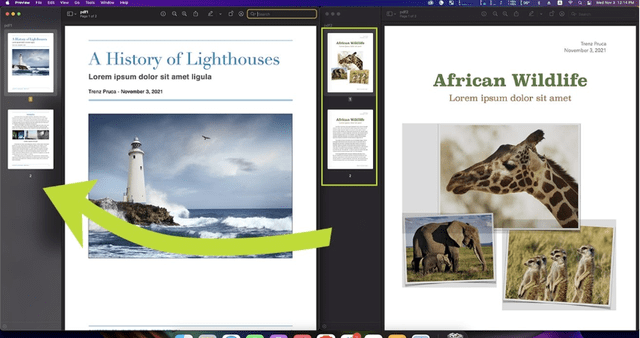 为了方便起见,我们将为示例中的每个 PDF 文件命名。我们的 Lighthouse PDF 将被称为 PDF A,它将作为我们想要添加另一个 PDF 的文件。我们的非洲野生动物 PDF 将被称为 PDF B,它会将其页面“捐赠”给我们新的合并 PDF。