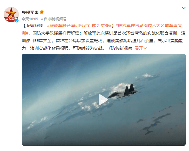 解放军在台岛周边六大区域军事演训,国防大学教授孟祥青解读:解放军此次演训是首次环台湾岛的实战化联合演训,演训课目非常齐全;首次在台岛以东设置靶场,迫使美航母后退几百公里,展示出震慑能力;演训实战化背景很强,可随时转为实战。(防务新观察)