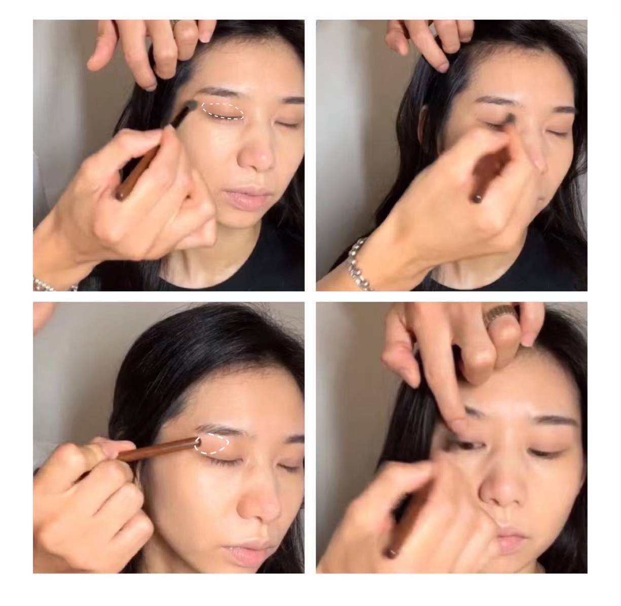 沿着双眼皮之上一点点,不要晕染得过上,大概上眼皮上面1-2毫米,眼尾部则可以稍微晕染大一些,晕染完后可以在眼头、眼尾处稍微加大,这样能更有立体感。