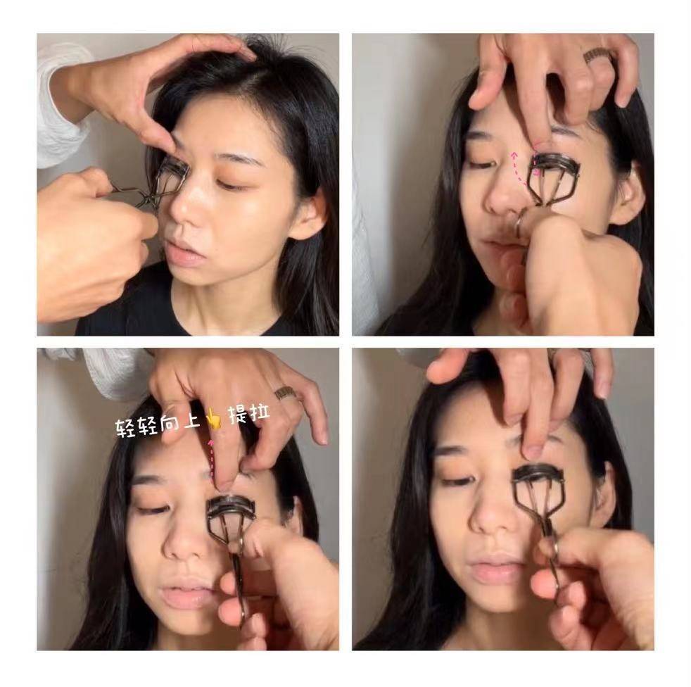 可以倾斜睫毛夹的角度,分边去夹,比如眼头、眼尾,单独夹,比如你要夹眼尾的睫毛,你眼神可以朝内眼角并向下看,这样眼尾的睫毛被完整夹到的概率会更大。眼头同样,眼神像另一侧下方看,就能全方位的照顾到整个睫毛,夹出自己想要的睫毛形状。