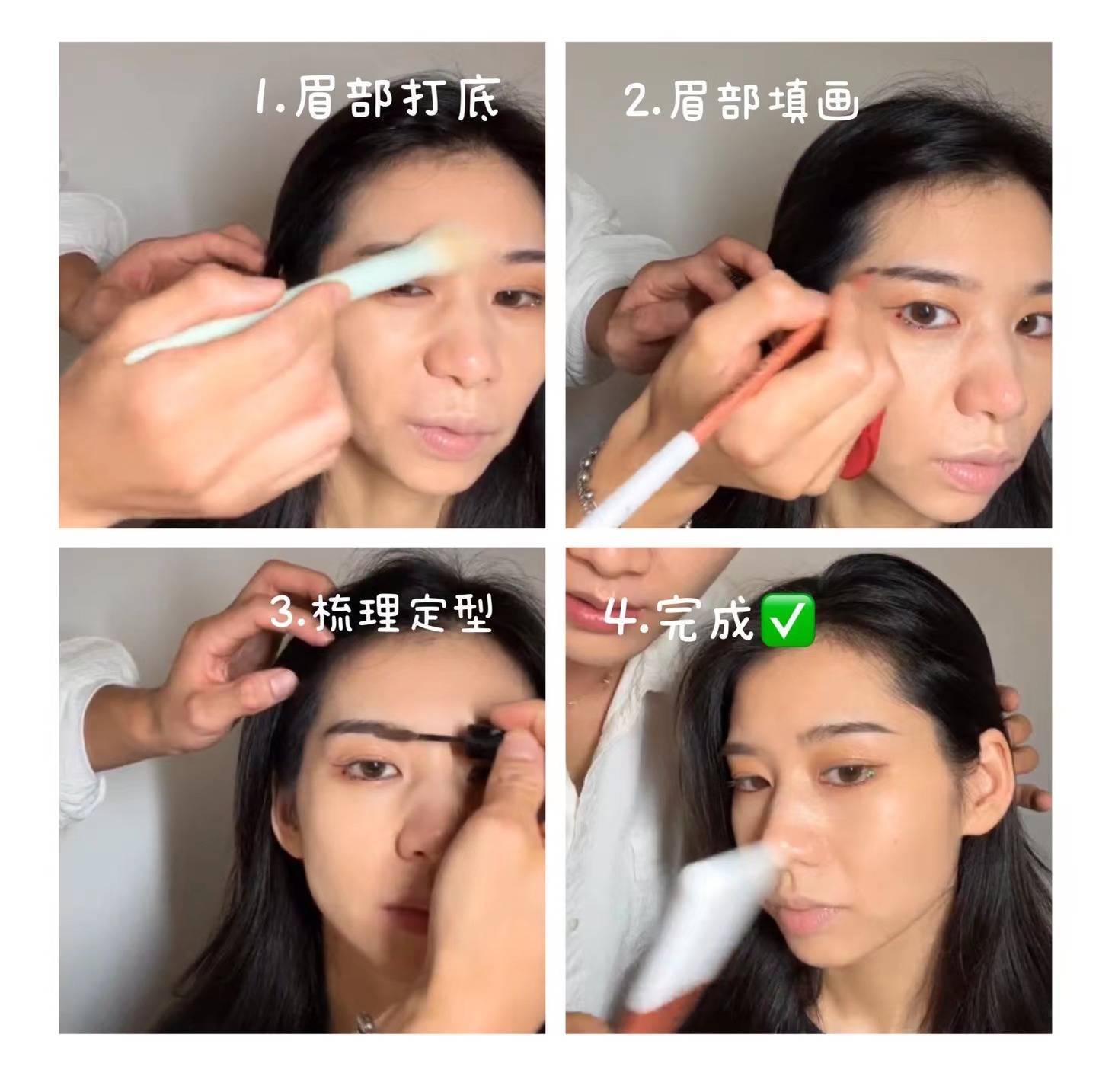 眉中段和眉尾适当补充,画眉一定不要画得特别实,眉毛和眼妆一样关键,如果画得特别实会给人感觉妆感很重、很凶,要前虚后实。