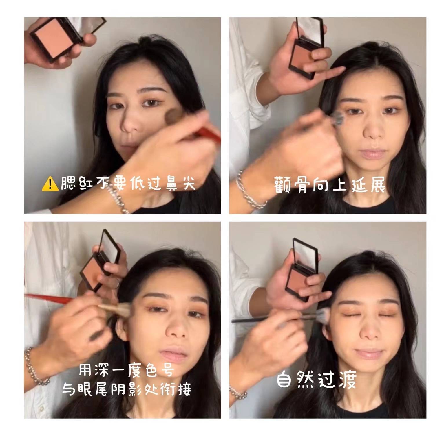注意腮红千万不要低于鼻尖,这样整个苹果肌会显得下垂。然而可以无限靠上,甚至是眼尾的部位,只要不显得突兀,衔接得比较好,都是可以的。
