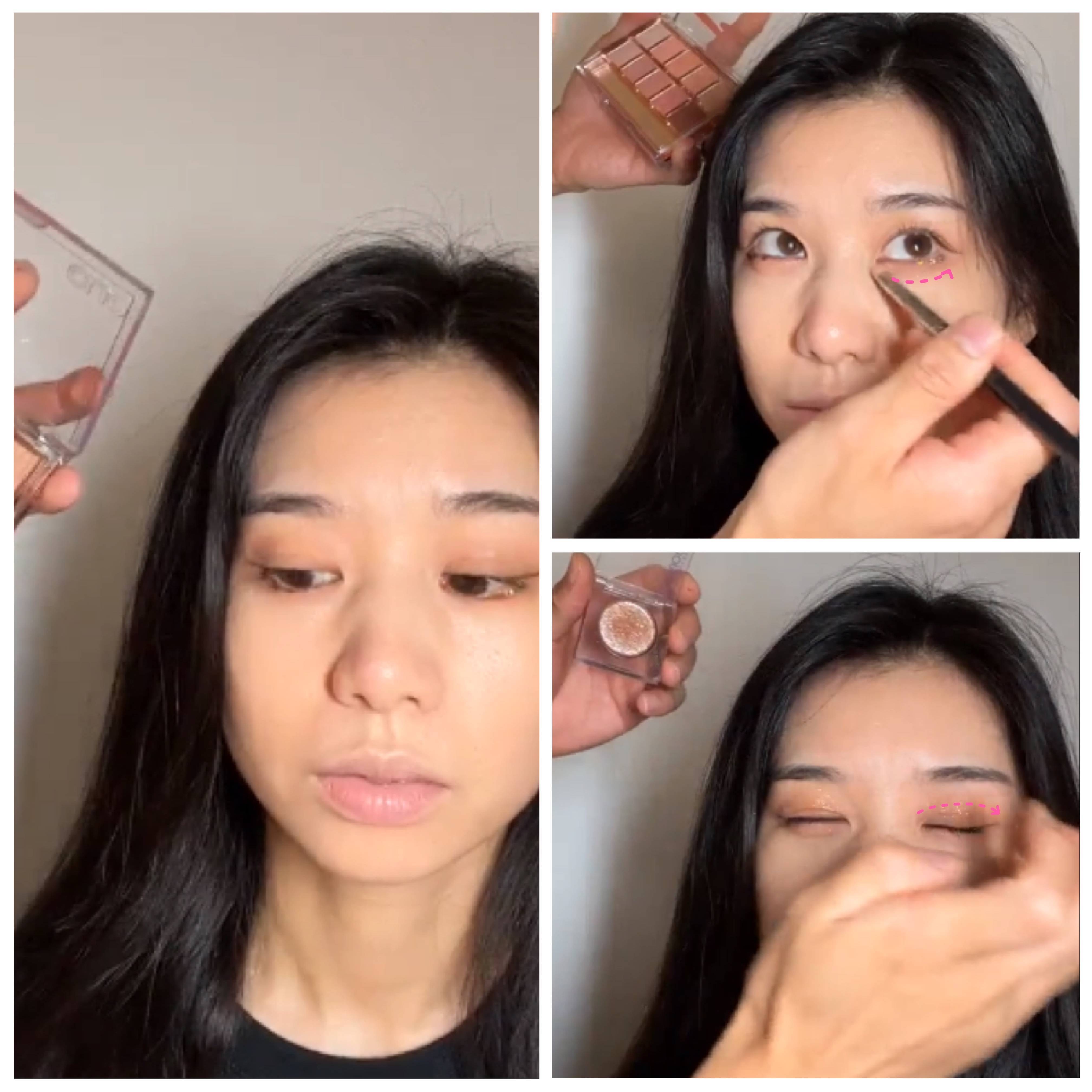 眼影可以换一个稍微深一度的颜色,或是换一个眼影盘取色,选咖色做小范围的晕染,把双眼皮的轮廓塑造出来。