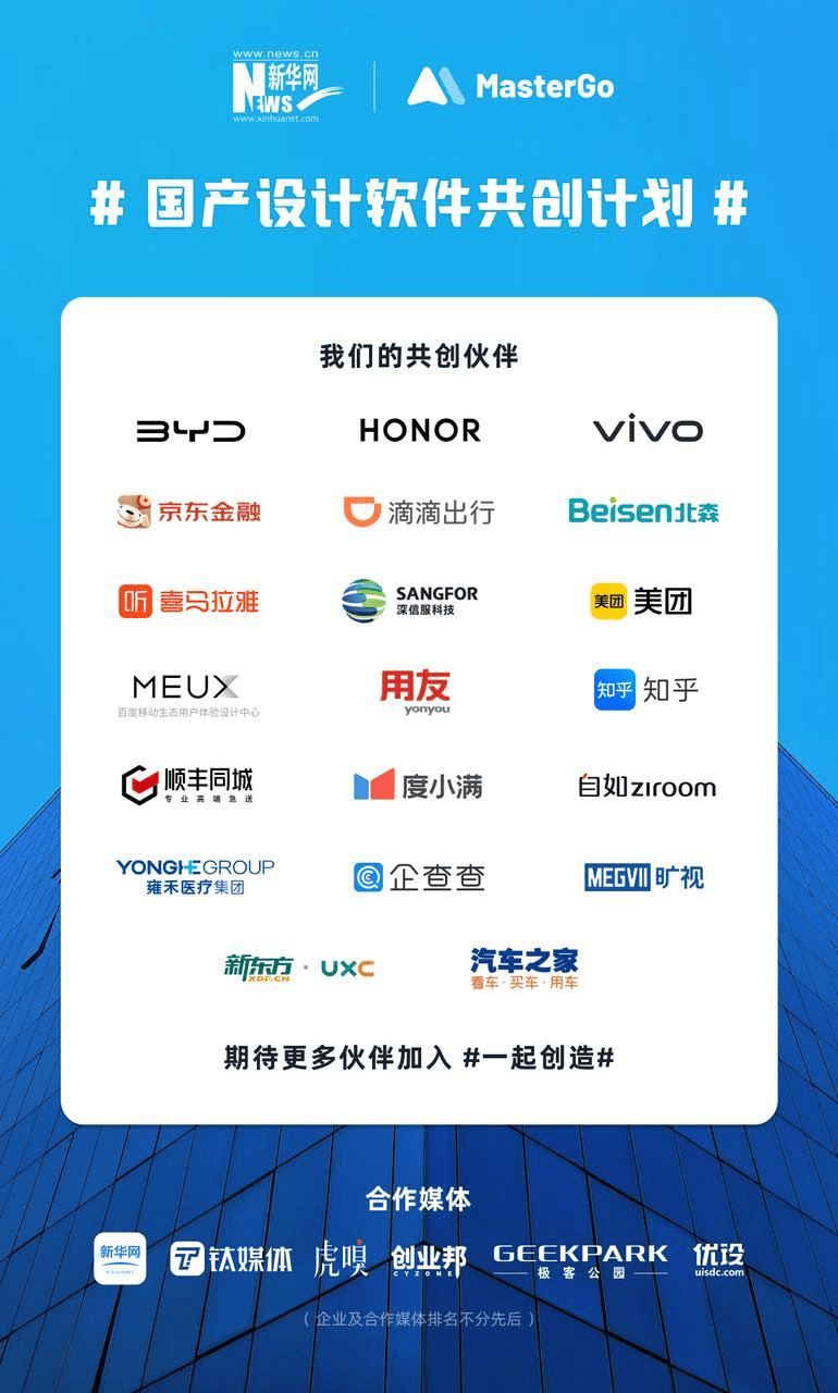 此外,MasterGo 今年 4 月还推出了“国产设计软件共创计划”,致力于解决软件开发者和终端使用者之间的沟通断层,产品以更高的使用体验标准及性能标准为导向进行共创和迭代,一起为数字化创作团队打造性能更高、产品体验更好的设计软件。目前包括比亚迪、荣耀、vivo、京东金融、滴滴出行、美团、深信服等 30 余家国内不同行业的头部团队和企业纷纷选择加入该计划并与 MasterGo 深度共创。