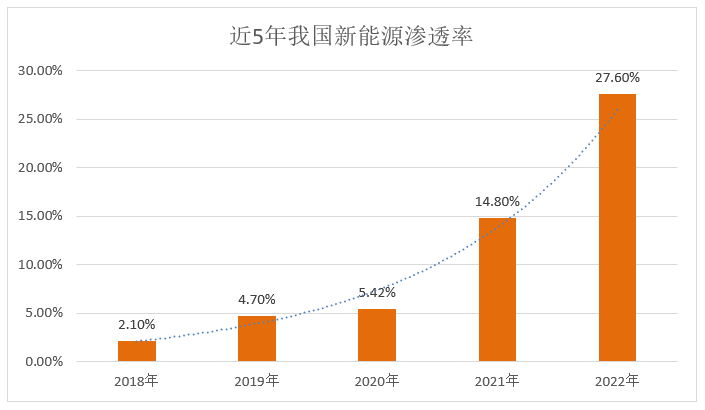 不过,时隔5年之后,汽车市场的变化是巨大的。过去5年,我们的新能源渗透率从2.1%,快速提升至27.6%,意味着2022年每卖10台车,就有接近3台是新能源汽车。
