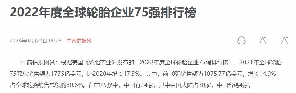 美国的《轮胎商业》杂志,每年都会根据上年的营业额,评选全球轮胎75强。2022年度的全球75强之中,中国有34家企业上榜(包含中国台湾),上榜企业数量仍遥遥领先于其他国家或地区。