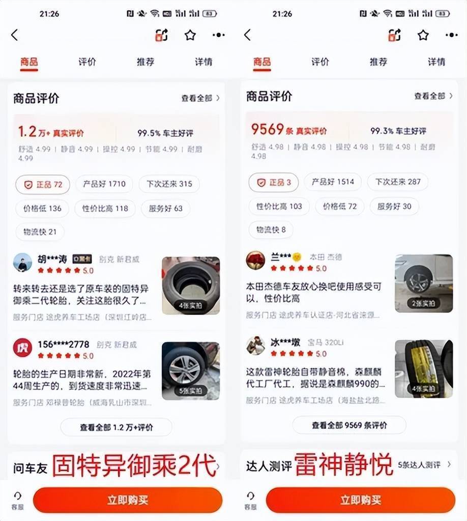 而在销售终端上看,途虎养车的轮胎评论数量可以作为参考。固特异御乘2代作为上市多年的外资舒适静音取向轮胎,累计的评价是1.2万条,而中国品牌雷神静悦,悄然获得了超过9500条用户评价。