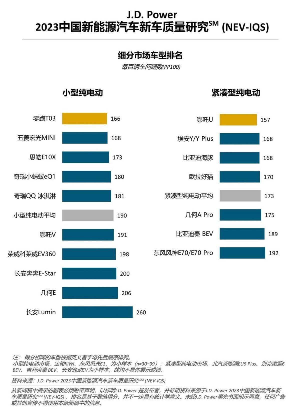 最近,全球领先的消费者洞察与市场研究机构J.D. Power正式发布了2023中国新能源汽车新车质量研究报告,其中零跑T03以166个PP100领跑小型纯电动车细分市场新车质量排行,同时,该细分市场的平均值为190个PP100。