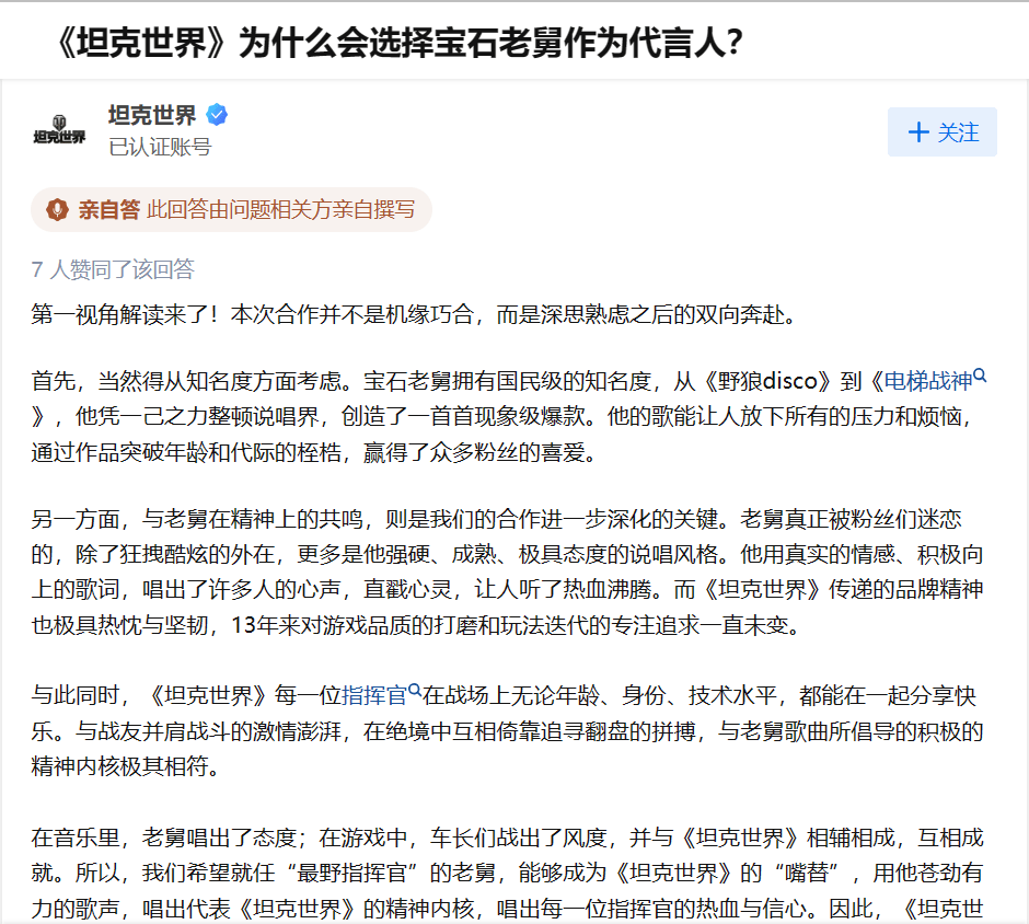 正是这种能打造出凛冽质感的硬核创作水准,吸引了同样擅长展现钢铁力量的《坦克世界》。在某知名问答平台上有个问题:《坦克世界》为什么会选择宝石老舅作为代言人?《坦克世界》官方号亲自下场回答了这个问题。