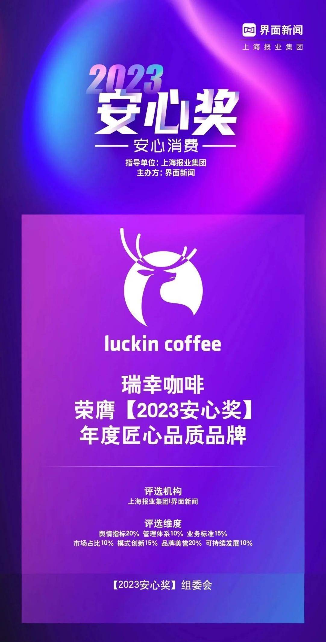 近日,大家常喝的瑞幸,在知名媒体界面新闻主办的2023新消费盛典上,荣获“2023安心奖——年度匠心品质品牌”奖项,瑞幸咖啡品质又获得权威认可!
