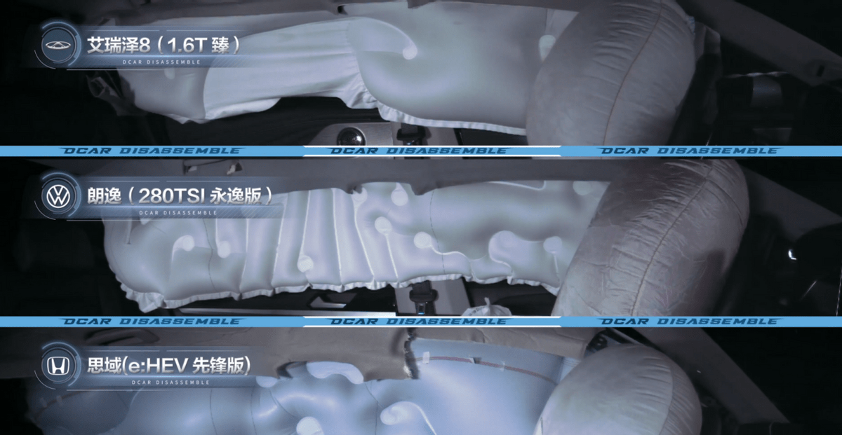 所以在汽车发生侧面碰撞时,驾乘人员主要受伤害区域集中于头部、颈部、胸部、腹部等上半身区域。而侧气帘在碰撞时,像窗帘一样覆盖住整个车窗。从而能够有效的避免车内乘员头部与车体侧围或顶窗边梁发生直接接触,更重要的是避免了车体乘员头部与车外壁障发生直接接触所可能造成的严重伤害。所以侧气帘的面积,以及充气量的多少直接影响了气帘对于乘员的保护作用,这些看不见的地方也是厂家的成本控制点。在懂车帝《懂车大爆炸》测试中,艾瑞泽8除了配备同级独有的10气囊全面保护之外,其中侧气帘有着面积大,充气量足等明显优于同级车型的领先优势。艾瑞泽8正是因为拥有着扎实的用料与良心的安全配置,才能在碰撞事故中对乘员有着极致的安全保护。