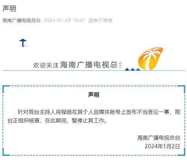 据海南广播电视总台消息,针对我台主持人肖程皓在其个人自媒体账号上发布不当言论一事,我台正组织核查,在此期间,暂停止其工作。