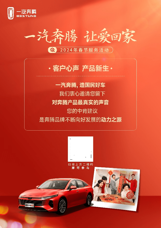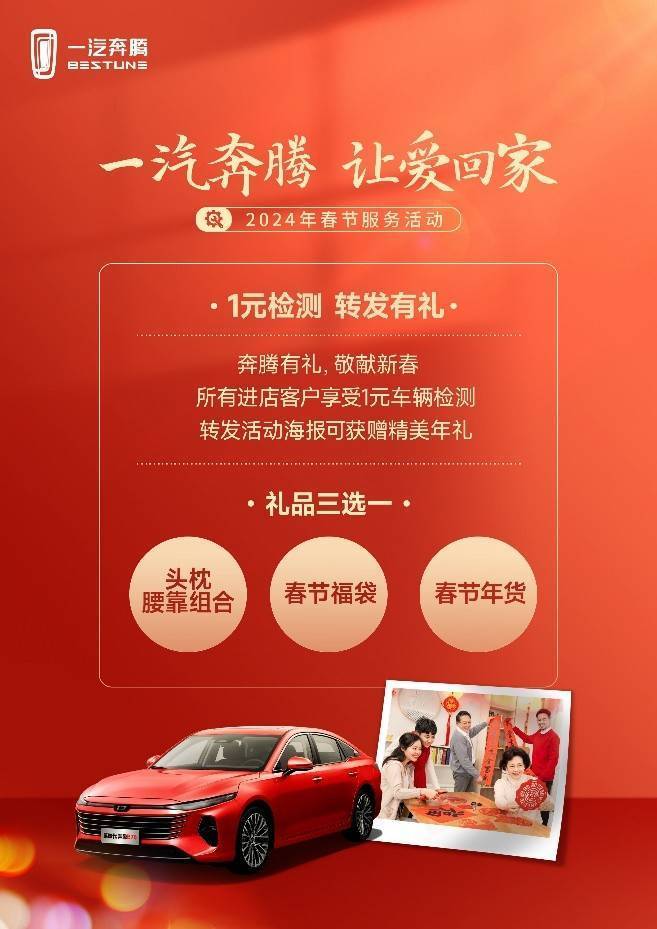 辞旧迎新近岁末,归家之心意正浓。2024年让爱回家服务活动再次全新开启,将为奔腾用户带来贴心暖心的“挚·心关怀”。更多福利回馈还请到店咨询,先到先得,赶快行动起来吧!龙年春节,让爱车焕新出发,让爱伴你回家!