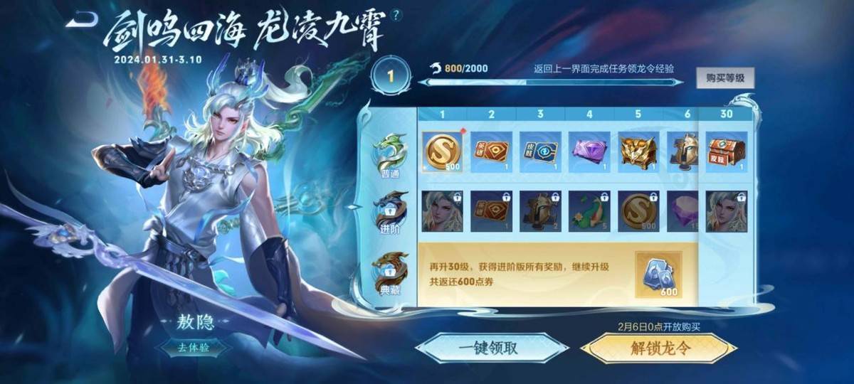 关于如何将敖隐纳入囊中,官方特别推出了“限时龙令”活动。这是一项类似于荣耀战令的限时活动,通过完成任务获取经验,提升龙令等级,领取丰富的奖励。活动时间为1月31日-3月10日,其中2月6日0点-3月10日23:59:59可以购买进阶龙令,2月6日0点-2月16日23:59:59可以购买典藏龙令。