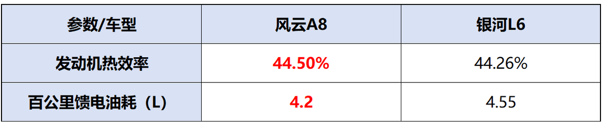 在这方面,奇瑞风云A8展现了它的卓越优势。其搭载全新第五代ACTECO 1.5TGDI高效混动专用发动机,发动机热效率高达44.5%,更好地将燃料能量转化为动力,减少能量损失,从而实现更低的油耗。相比之下,银河L6的发动机热效率为44.26%,略逊一筹。具体到油耗表现,风云A8的百公里馈电油耗仅为4.2L,而银河L6的相应数据为4.55L。在长期使用中,风云A8能够省下更多油费,在经济效益上更占优势。