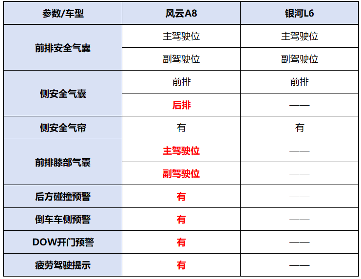 此外,风云A8还引入了多项主动安全配置,如后方碰撞预警、倒车车侧预警、DOW开门预警和疲劳驾驶提示,这些都是银河L6所不具备的。这些贴心的主动安全配置不仅能在关键时刻提醒驾驶员避免潜在的危险,也体现了风云A8对驾驶安全的全面考虑。