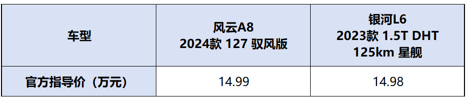 面对市面上琳琅满目的汽车产品,如今人们在选择汽车时更加注重其经济性、续航能力以及安全性。在众多产品中,奇瑞风云A8和银河L6作为家轿市场上的两款热门车型,在节能、性能、智能配置和安全方面的表现各有千秋。今天,笔者将选择以上产品的顶配车型——风云A8 2024款 127 驭风版(以下简称“风云A8”)和银河L6 2023款 1.5T DHT 125km 星舰(以下简称“银河L6”),从多方面进行详细对比分析,看看谁更胜一筹!