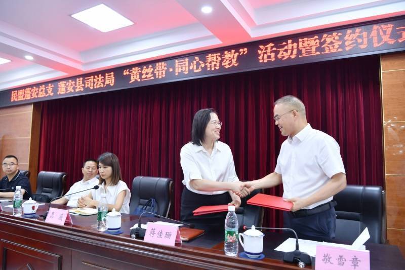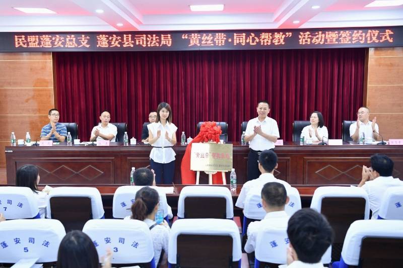 签约仪式上,民盟蓬安县总支和县司法局签订了“黄丝带•同心帮教”合作框架协议,余新平和吴薇为“黄丝带帮教基地”揭牌。