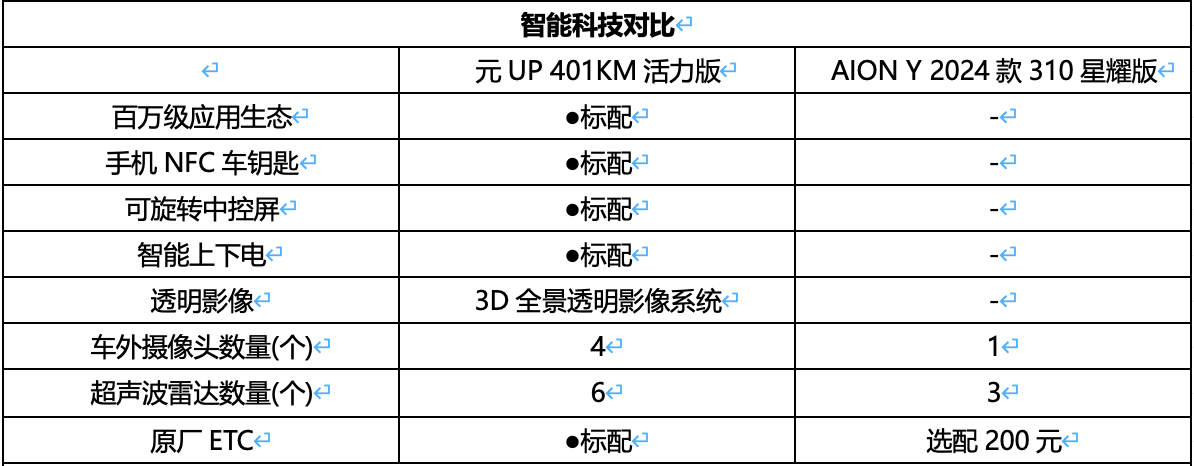 尤其在年轻用户看重的智能科技体验上,元UP的优势更加明显,搭载的DiLink智能网联系统支持百万级应用下载,自适应旋转悬浮Pad可横屏看导航、竖屏刷抖音,随时解锁最潮科技体验,同时标配手机NFC车钥匙、智能上下电、3D全景透明影像系统、原厂ETC等智享功能,配备更多的车外摄像头和超声波雷达。相比之下,AION Y在屏幕和智能方面也有一番作为,但在配置的全面性和丰富性上,元UP要更胜一筹。