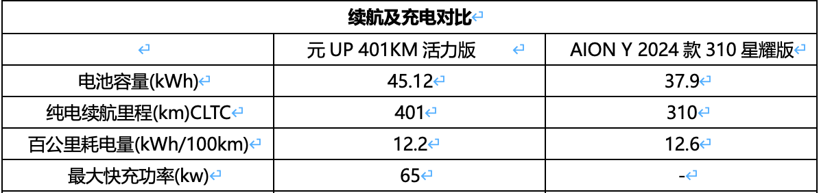 对于快生活节奏的年轻用户而言,花同样的钱买到更长的纯电续航,对日常用车便利至关重要。元UP配备 45.12 kWh刀片电池,不到10万元就能获得超400km的纯电续航,百公里耗电量为12.2kWh,而AION Y纯电续航只有310km,百公里耗电量12.6kWh,前者纯电续航要多出近三分之一,而且续航扎实度、真实续航表现都要优于后者。此外,元UP还拥有后者不具备的直流快充,功率达到65kW,能够让年轻人随时畅享满电出发的纯电出行自由。