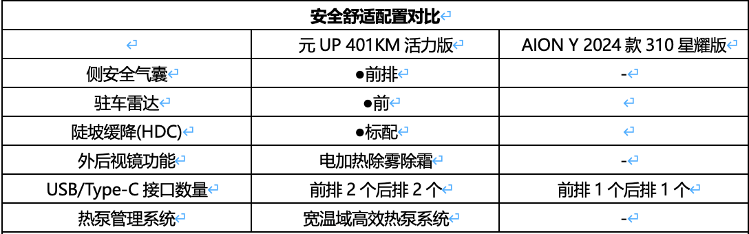 此外,许多年轻用户都是新手司机,选第一台车的时候需要更充足的安全保障。元UP提供了更加丰富齐全的主被动安全配置,比AION Y多出了前排侧安全气囊、驻车雷达、陡坡缓降、外后视镜电加热除雾除霜等配备,还拥有宽温域高效热泵系统,在实用性和环境适应性上比AION Y更胜一筹,能够让年轻用户更加安全安心的享受纯电出行。