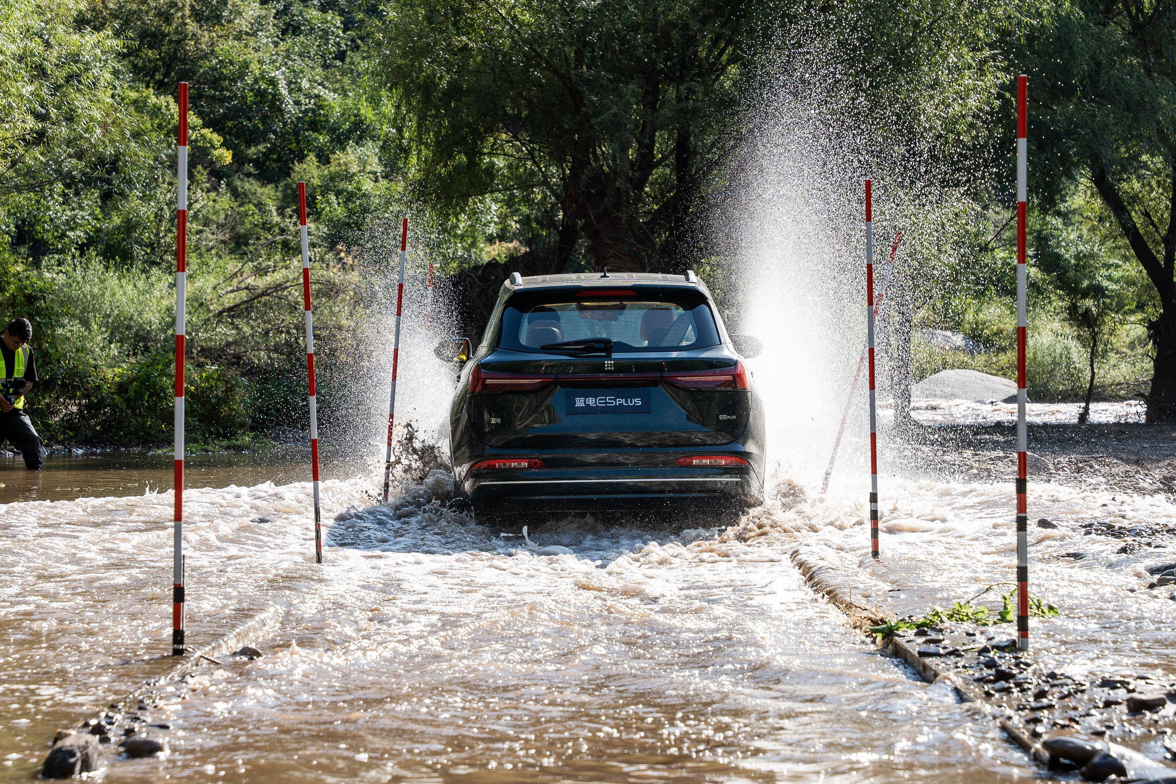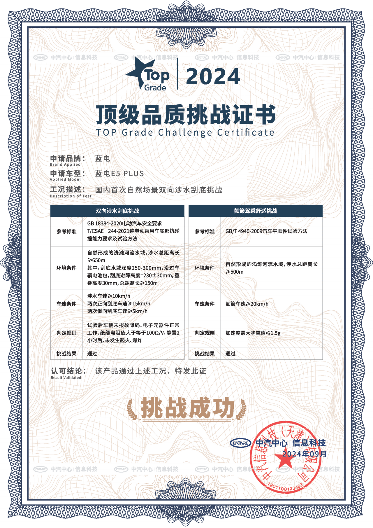 在大会期间,蓝电E5 PLUS通过了一系列极限工况的挑战,特别是在中汽中心TOP Grade国内首次自然场景双向涉水刮底挑战中,展现出了令人瞩目的表现。挑战环境模拟了消费者真实用车场景中的极端条件,包括双向涉水刮底和颠簸驾乘舒适两大项目。