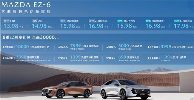 除了在安全性能上的优秀表现,MAZDA EZ-6还为消费者提供了完备的购车权益,吸引更多潜在用户。这些权益包括八重EZ尊享礼包,至高可达30,000元的购车优惠。其中,具体的细项如EZ焕新礼10,000元、EZ安芯礼7,999元、EZ升级礼5,000元、EZ补能礼3,999元、EZ畅玩礼1,390元(包含10G/月娱乐流量两年免费)、EZ护航礼1,399元(首年享至高600万元智驾保障)、EZ拥车礼699元以及EZ金融礼(1.99%起年均费率,12-60期个贷)。