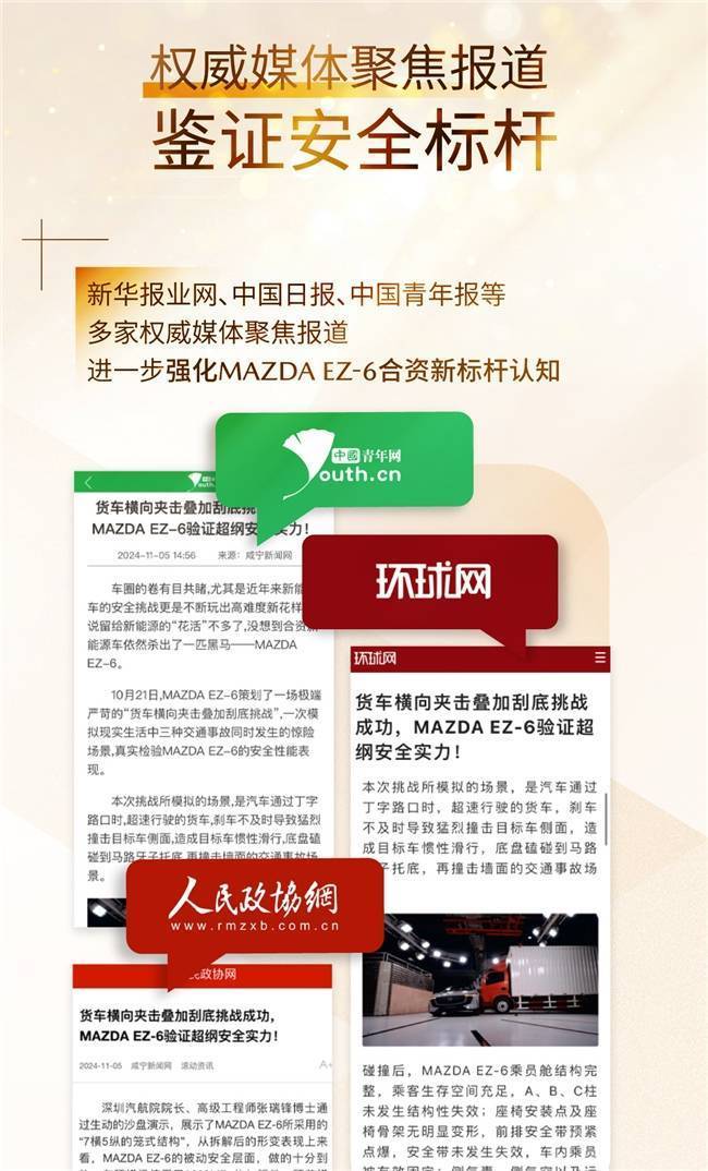 为了向广大消费者详细介绍MAZDA EZ-6的安全性能及技术实力,长安马自达还将联合浙江卫视推出三条关于MAZDA EZ-6的安全专题片,这些专题片将全方位展示车辆在各类极端测试下的优异表现,并进一步提升公众对其安全性能的认知。