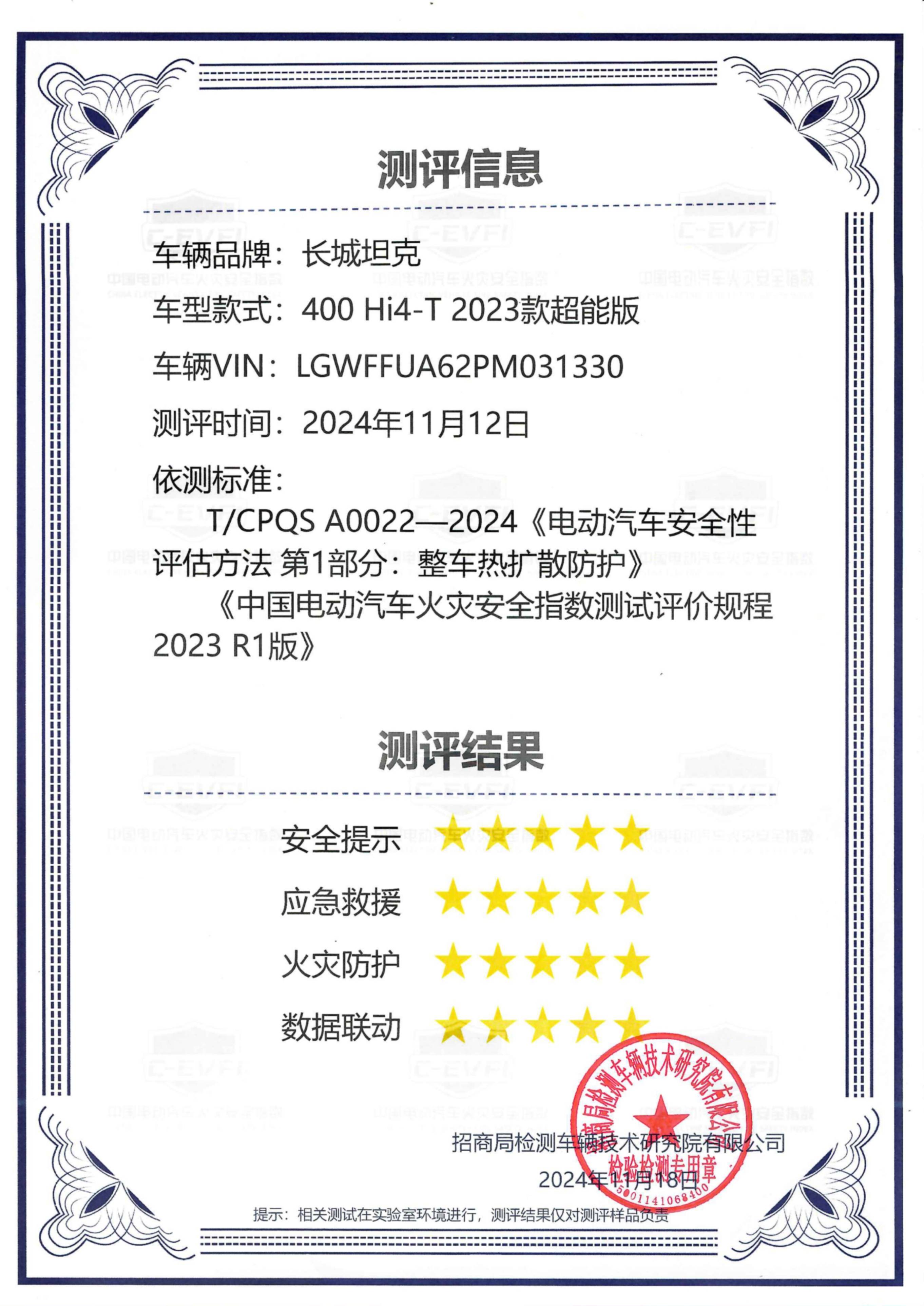 提到坦克400 Hi4-T,我们往往联想到的是强悍的越野性能,然而,越是在复杂的越野场景,就越要重视电池安全。此次电动汽车火灾安全指数认证,无疑将400 Hi4-T鲜为人知的电池安全呈现在用户面前,增加了用户对以坦克400 Hi4-T为代表的新能源越野车型信任感。