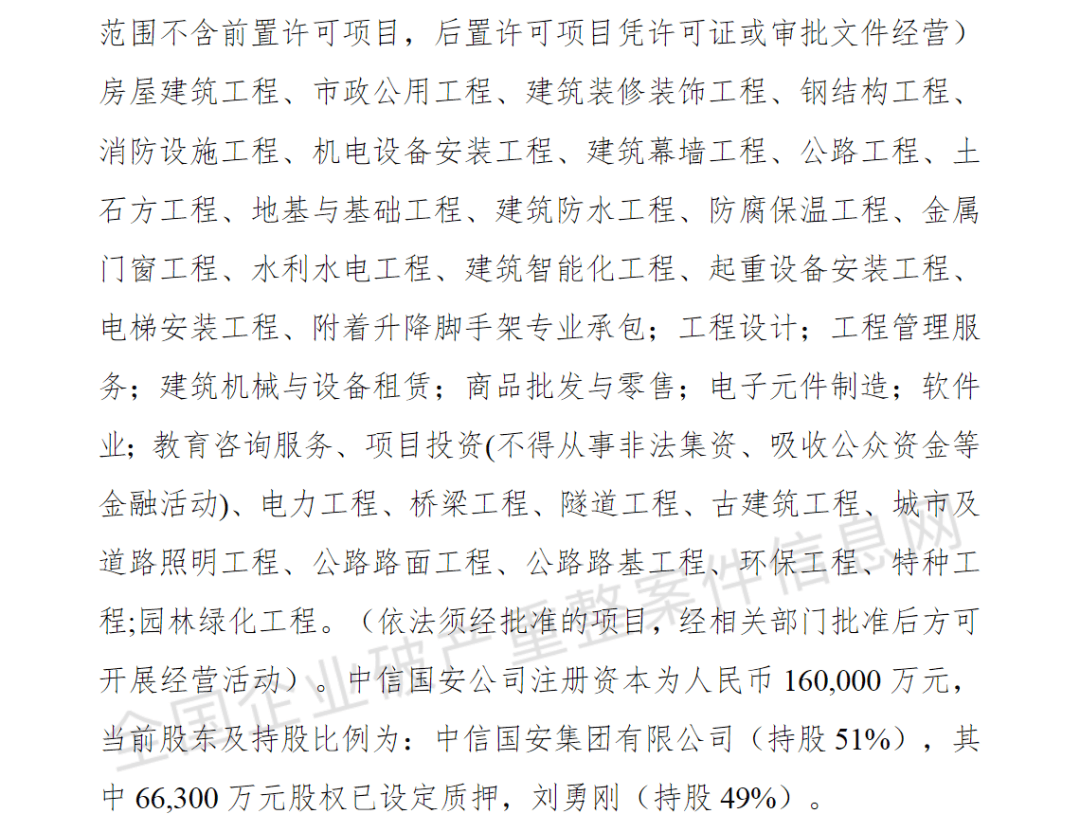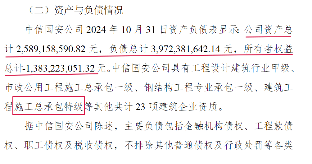 中信国安公司2024年10月31日资产负债表显示:公司资产总计25.89亿元,负债总计39.72亿元,所有者权益总计-13.83亿元。中信国安公司具有工程设计建筑行业甲级、市政公用工程施工总承包一级、钢结构工程专业承包一级、建筑工程施工总承包特级等其他共计23项建筑企业资质。
