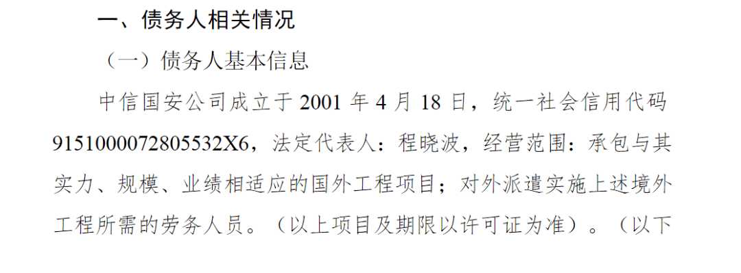 据中信国安公司陈述,主要负债包括金融机构债权、工程款债权、职工债权及税收债权,不排除其他普通债权及行政处罚等各类债权。