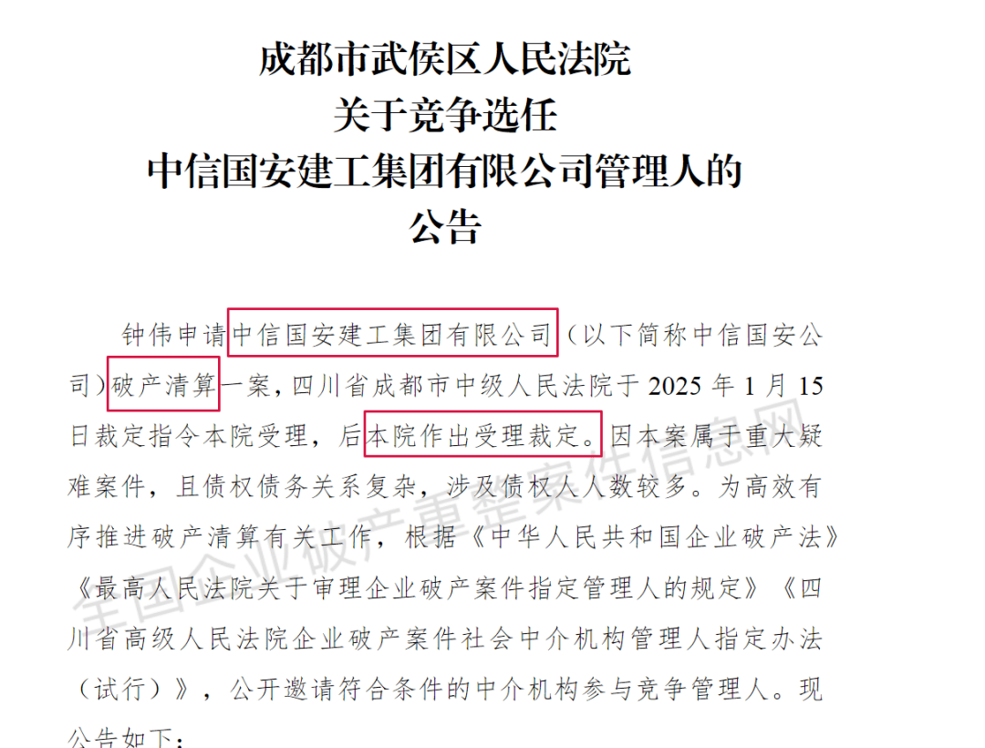3月25日消息,成都市武侯区人民法院发布《关于竞争选任中信国安建工集团有限公司管理人的公告》。