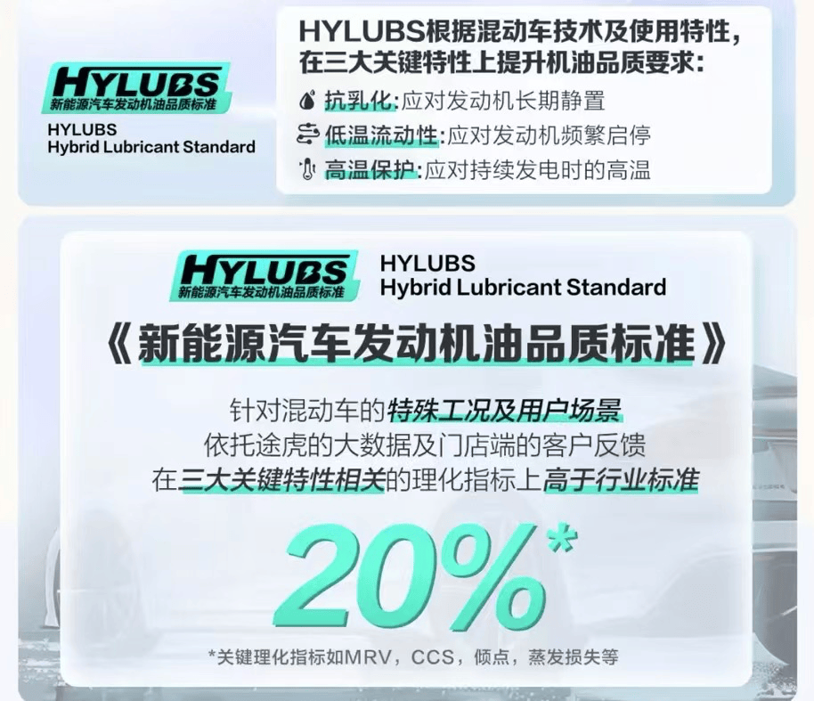 现在,专业标准建设取得新突破。途虎养车制定的"HYLUBS"混动工况机油标准,围绕新能源车内燃机的运行特性,从耐久性能、系统兼容性等关键要素构建认证体系,实施量化准入标准,在技术指标和公信力层面均达到行业领先水平,有效优化车主选购体验。