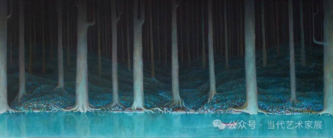 创作理念:这幅作品源于一场萦绕不散的梦境:在漆黑的夜色中,一条泛着蓝色荧光的河流蜿蜒流淌,河岸两侧的参天古树以盘根错节的姿态肃立,如沉默的守卫者;河面上一艘无人乘坐的小舟缓缓漂过,仿佛被某种不可见的力量牵引着。梦中,我曾长久驻守于此,耳畔回响着河流的低语——“等她来了,你才能离去”。对此产生疑惑与不解,她是谁呢?她在何处?她出现了吗?又或者~‘她’是否存在呢?这一幅描绘梦境的画作不仅带入一个既真实又梦幻的世界,更是一次对自我、对未知、对生命意义的深度探寻。