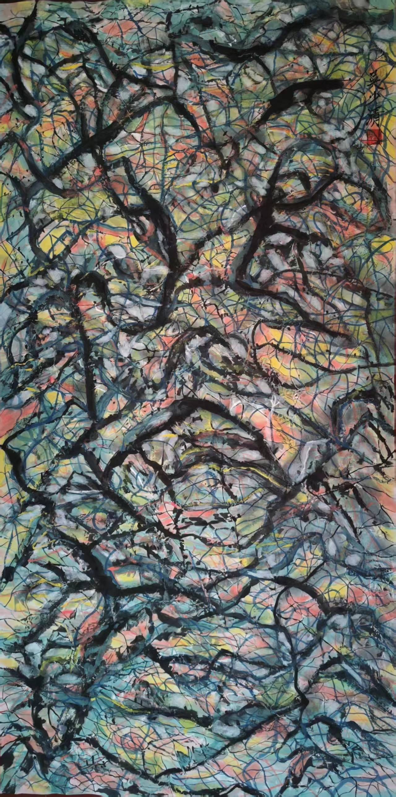 创作理念:通过这幅由各种不同色彩的浓淡干湿,粗狂粗涩及细腻的线条,不规则的色块构成的的绘画作品,作者意图用跨越传统与现代、东方与西方界限的独特艺术语言,体现出大自然的雄伟壮阔与不可侵犯,及人类对大自然这一自身生存根基与源泉发自内心深处的敬畏与眷恋之情;人类对自然之美的欣赏与对宁静和谐生活的向往,对自然家园深深的情感羁绊;同时画面里的破碎、不规则的色快和锐利粗细线条,从另一个角度象征着生命中的磨难与挫折,暗示着生活的坎坷,而所有这些又相互支撑,形成一种虽历经破碎却依然凝聚的态势,表达出人类在面对各种困境,始终保持着坚韧的精神,不向命运低头,顽强的精神和生命力。