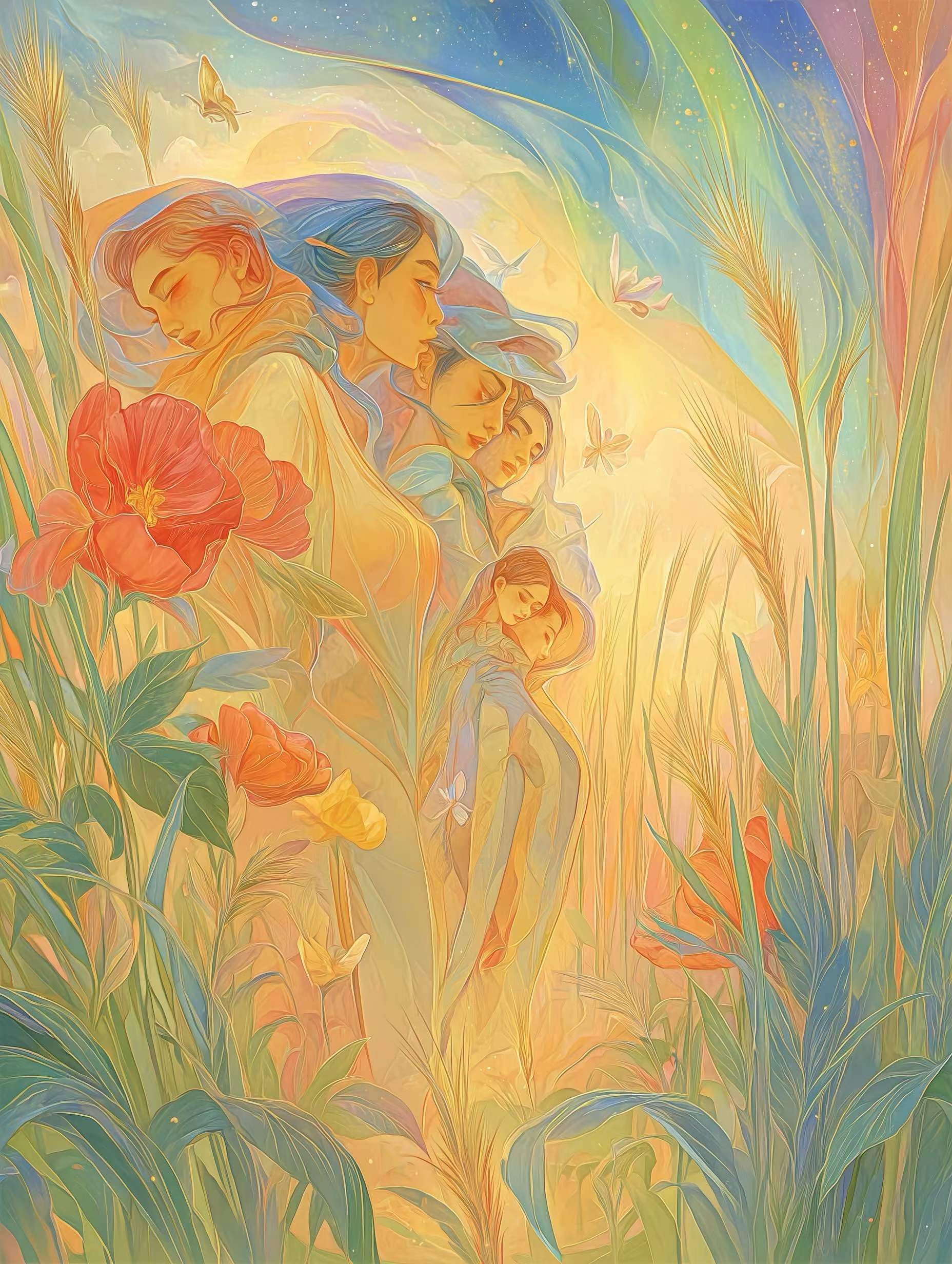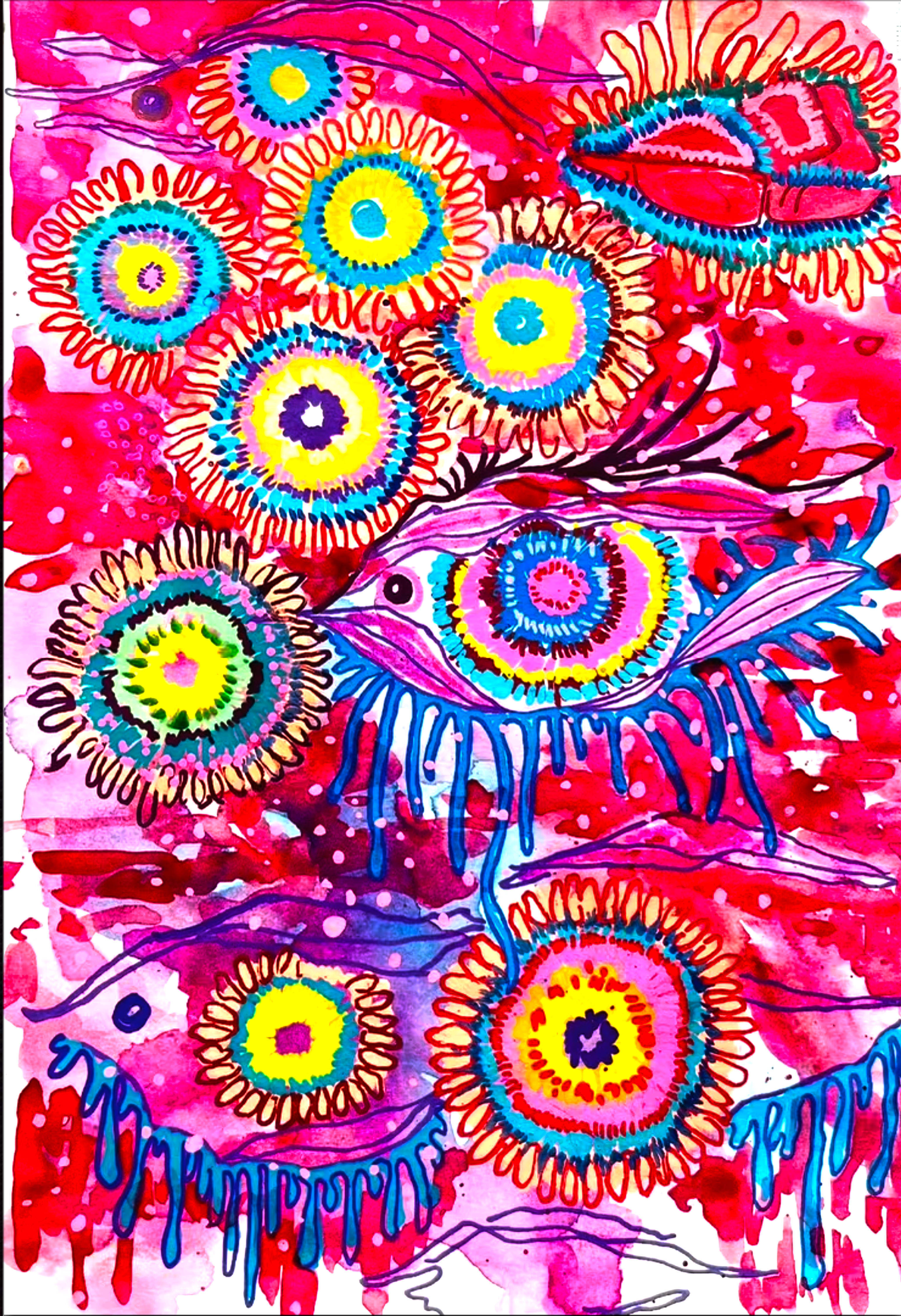 作品介绍:通过色彩丰富且层次感强烈的图像,探索了情感的流动、成长的挣扎以及自我治愈的过程。画面中的鲜艳海葵和流动的鱼形象,仿佛象征着内心的情感波动与灵魂的觉醒。鲜明的色彩代表着不同的情绪层次。从痛苦的深红到希望的蓝色,每一层色彩的交织反映了复杂的心理变化。鱼和花朵的结合象征着从困境中浮现的力量与生命力,这些情感的流动不仅是外在的视觉表现,更是深层次的自我对话。作品触及观者内心最深处的情感需求,传递了情感共鸣与自我治愈的力量,引发对内心世界的反思。每一笔每一色都充满了能量、提醒我们即使在痛苦中,也能找到治愈与重生的契机,正如每一滴水花中的波动、最终汇聚成心灵的宁静与和谐。