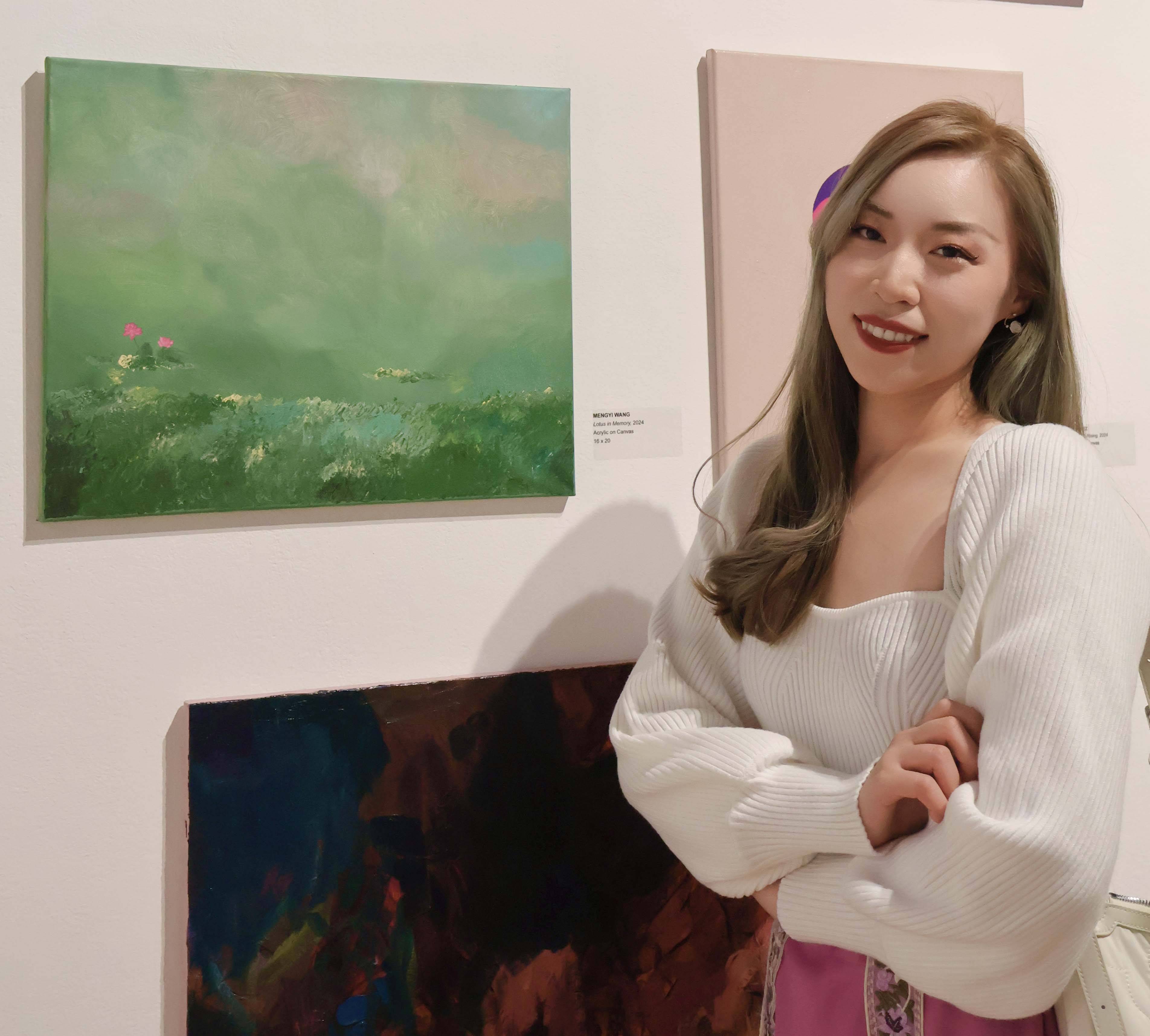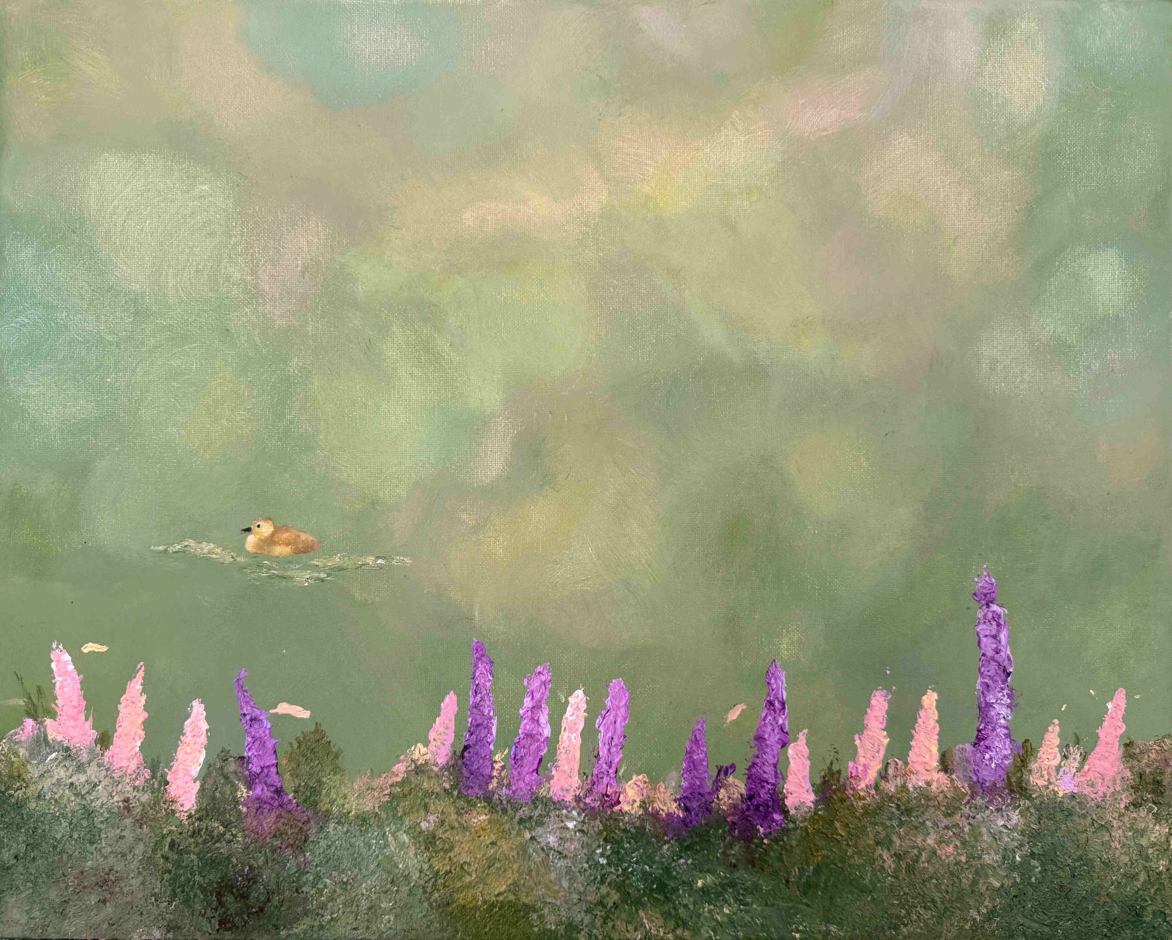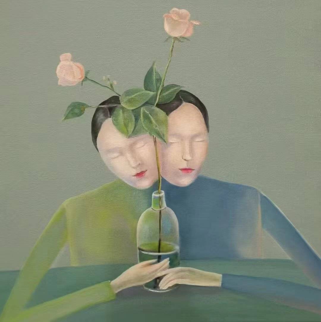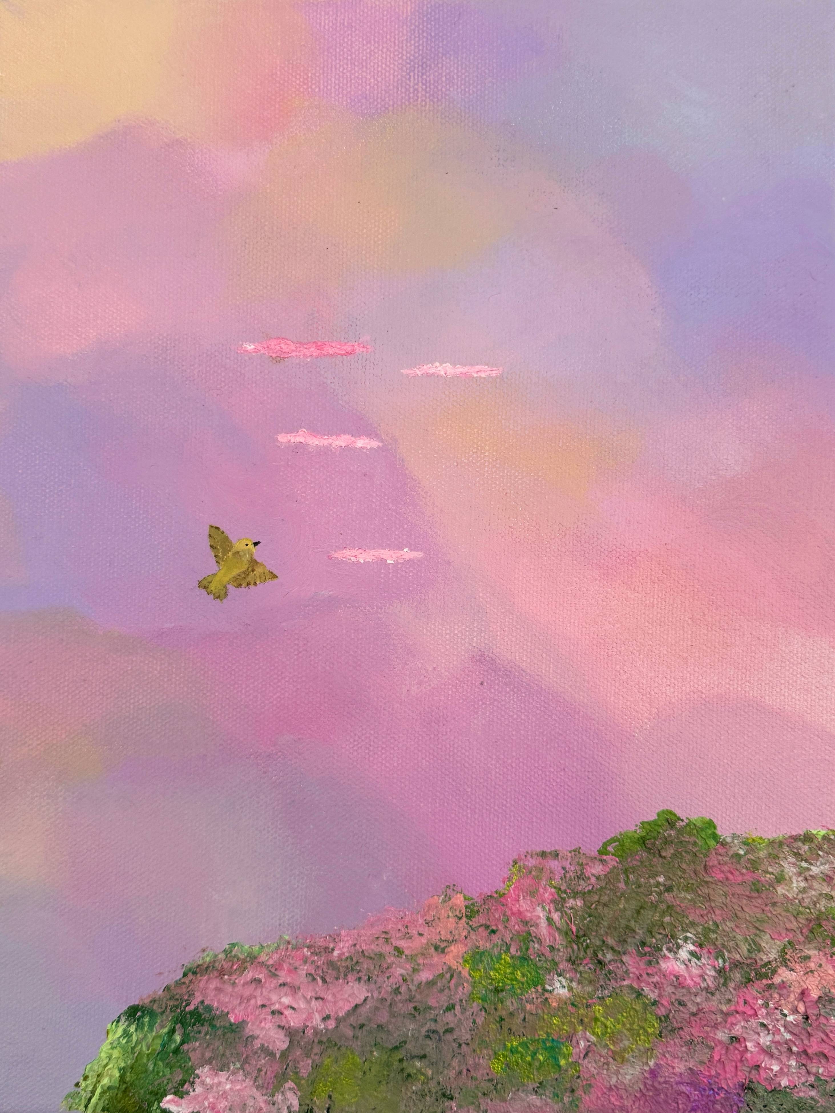 创作理念:绘画灵感来自现代印象派和中国传统绘画艺术的融合,王梦伊的丙烯作品用温暖的色调将作者周围的风景带入了幻想的时间线,捕捉季节和花丛的动态。不同色调的粉紫和绿色营造出无缝的场景,将花丛与天空融为一体,透过这片亦虚亦真的风景,邀请观者沉浸于作者的叙事故事中。